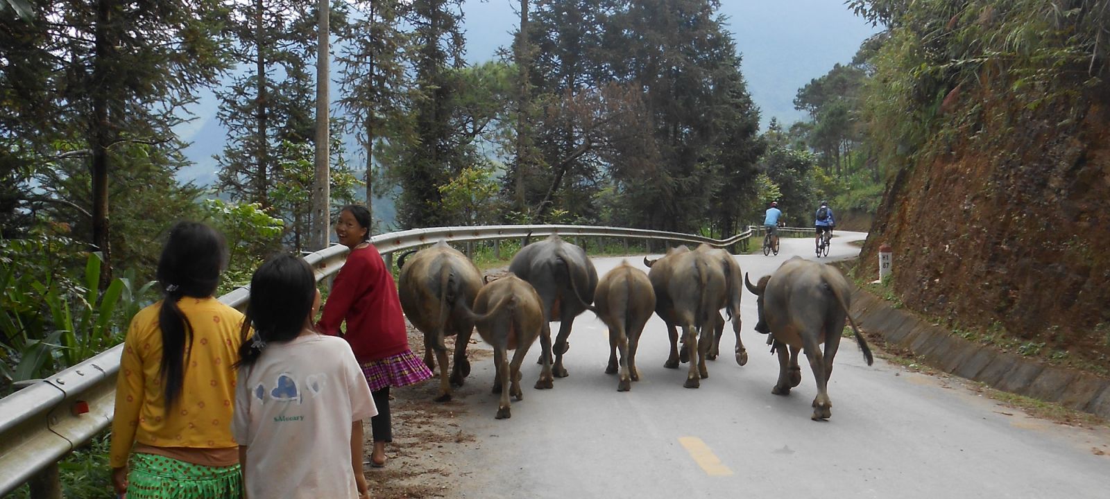 Setting off this morning, we head out of town cycling for the first 25km on relatively flat road through a landscape of terraced rice paddy fields. Passing through minority villages we cycle the next 25km up winding roads into the vast limestone mountain range with its perpendicular walls of rock, climbing 800m towards the mountain road pass 'Heaven Gate'. As we ride through mountain villages, sometimes cloaked in clouds, we will receive a friendly greeting from the local communities. From the pass we have amazing views, including the famous vista of the Tam Son valley with the 'Twin Hills'. In the distance we'll see Quan Ba town, our destination, in its beautiful location. It's mainly downhill for the last 15km into Quan Ba.